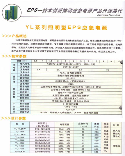 EPS 益和亞力電氣創(chuàng)導(dǎo)光明與動(dòng)力 產(chǎn)品用途: 為消防應(yīng)急照明、消防動(dòng)力或其他特別重要的負(fù)荷提供應(yīng)急電源的裝置;用于高層建筑、商場(chǎng)、醫(yī)院、金融單位、人防工程、地鐵隧道交通、會(huì)場(chǎng)、應(yīng)急供電車(chē)或其他需要提供應(yīng)急電源的場(chǎng)合;EPS輸出電壓:三相交流380V或單相交流220V,標(biāo)準(zhǔn) 、備用時(shí)間:90分鐘,輸出功率:0.5KW~800KW。(內(nèi)部配件均屬于國(guó)際知名品牌)