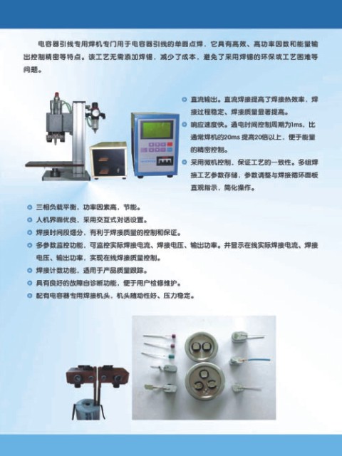 電容器引線專用焊機(jī)專門用于電容器引線的單面點(diǎn)焊,它具有高效、高功率因素和能量輸出控制精密等特點(diǎn)。該工藝無需添加焊錫,減少了成本,避免了采用焊錫的環(huán);蚬に?yán)щy等問題。