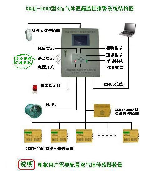 GKQJ-9000型SF6氣體泄漏監(jiān)控報警系統(tǒng),正是依據這些行業(yè)安全法規(guī)的要求而開發(fā)設計的一種智能化環(huán)境在線監(jiān)測系統(tǒng),它主要檢測環(huán)境空氣中SF6氣體含量和氧氣含量,當環(huán)境中SF6氣體含量超標(濃度應不超過1000ppm)或缺氧(含氧量應不低于18%),能夠實時進行報警,同時自動開啟通風機進行通風,并具有溫濕度檢測、工作狀態(tài)語音提示、遠傳報警、歷史數據查詢等諸多豐富功能。