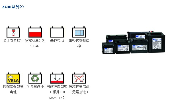 膠體dryfitA400系列電池是把普通電解液固定于膠體中的密閉式鉛酸可充電電池,膠體電池技術(shù)是陽光公司發(fā)明并實現(xiàn),實現(xiàn)了電池少維護(hù)耐重負(fù)荷,從而節(jié)省了維護(hù)、補水及檢查的費用支出。不再需要昂貴的、配有特殊設(shè)備的、單獨的電池室。膠體電池可以在安裝地充電。同普通液體電解液電池相比,運行費用可減少30%。