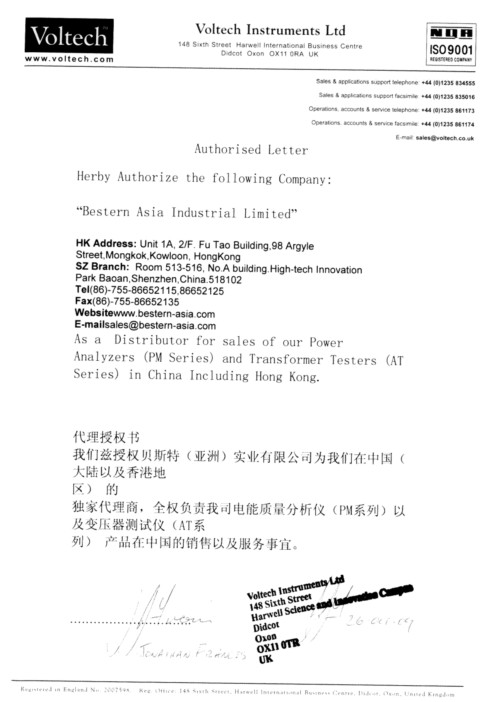Voltech授權(quán)代理證書