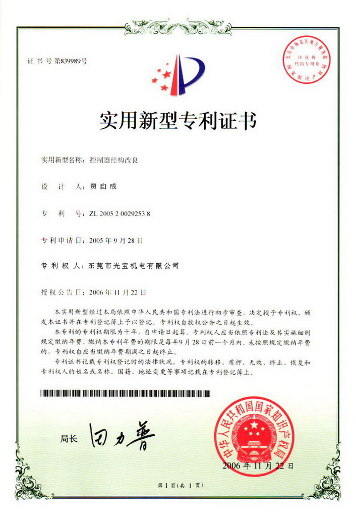 大陸實用新型專利證書