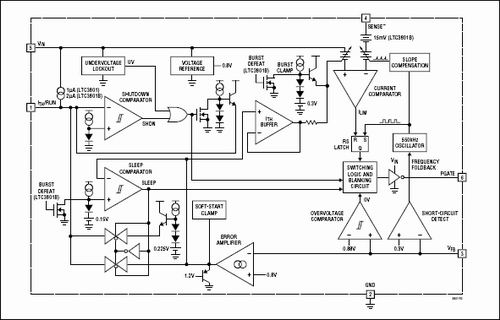 圖1:凌力爾特的LTC3801采用突發(fā)模式將靜態(tài)電流降至10至20uA。