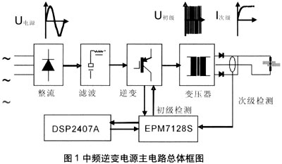 中頻逆變直流電阻焊機(jī)的供電電源是由三相工頻交流電源經(jīng)整流電路和濾波電容轉(zhuǎn)換成直流電源,再經(jīng)由功率開(kāi)關(guān)器件組成的逆變電路轉(zhuǎn)換成中頻方波電源,然后輸入變壓器降壓后,經(jīng)低管壓降的大功率二極管整流成直流電源,供給焊機(jī)的電極,對(duì)工件進(jìn)行焊接(見(jiàn)圖1)?刂齐娐凡糠钟蒁SP和CPLD組成,DSP(TMS320LF2407A)產(chǎn)生的PWM波和檢測(cè)信號(hào)、保護(hù)信號(hào)在CPLD(EPM7128S)里現(xiàn)實(shí)邏輯運(yùn)算。