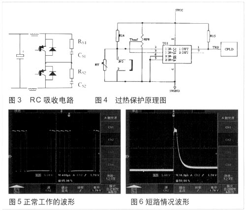 本文采用普通散熱器與強(qiáng)迫風(fēng)冷相結(jié)合的措施,并在控制電路上加過(guò)熱檢測(cè)保護(hù)電路,應(yīng)付IGBT與散熱器接觸不良或者非正常情況,在IGBT散熱片上安裝熱敏電阻,然后通過(guò)邏輯判斷電路給出信號(hào),供控制電路處理(見(jiàn)圖4)。