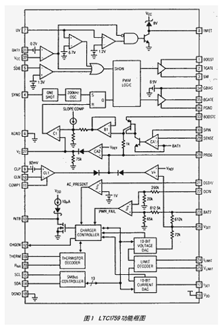 LTC1759包括:一個(gè)同步、電流模式、PWM降壓開關(guān)控制器,一個(gè)充電器控制器,兩個(gè)控制充電器參量的10位DAC,一個(gè)熱敏電阻安全信號(hào)譯碼器,硬件電壓和電流限制譯碼器和一個(gè)SMBus控制器單元(見圖1)。