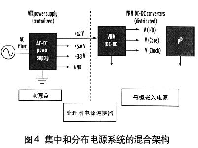 可以用集中和分布單元的組合設(shè)計(jì)電源系統(tǒng),如圖4所示的混合電源系統(tǒng)。集中電源產(chǎn)生5.0V和3.3V邏輯電源(其輸入為ac線)以及分布到電壓穩(wěn)壓器模塊(VRM)的12V dc電平。用VRM為高性能處理器提供很大電流、低電壓芯核和I/O電壓。VRM電源變換器放置在母板靠近處理器的 “負(fù)載點(diǎn)”處,這可減少電路板跡線電壓降,在不同的情況下,跡線電壓降對于有效的變換器工作是不能接受的。