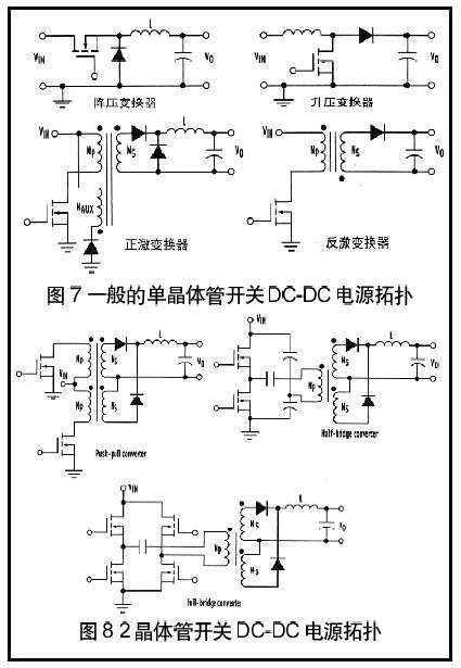 單晶體管拓?fù)?圖7),如降壓、升壓、正激、反激是在分布系統(tǒng)(高達(dá)100W)中設(shè)計(jì)用于相當(dāng)?shù)凸β守?fù)載的dc-dc變換器。降壓和升壓電路是非隔離的,而正激和反激變換器提供變壓器隔離。