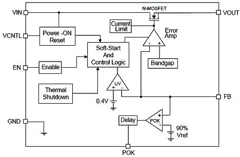 AX6610-6615系列ULDO產(chǎn)品設(shè)計皆采用雙電源之架構(gòu)來設(shè)計,電源VIN為輸出轉(zhuǎn)換的來源,電源VCNTL為內(nèi)部電路所用電源。再搭配使用N-MOSFET作為驅(qū)動器。AX6610-6615的參考電位設(shè)計在0.8伏特,因此最低的可輸出電壓可達(dá)0.8伏特。其輸出電壓軟啟動時間僅有1毫秒,可大幅降低開機(jī)時的電流浪涌。輸入電壓VIN、VCNTL皆具有過低電壓監(jiān)測功能,當(dāng)輸入電壓過低時會停止輸出,可避免本身IC端與后方系統(tǒng)端的功能誤動作。此外,為了確保后端系統(tǒng)所得到的電壓正確無誤,本產(chǎn)品具有Power-OK引腳,用以提供后端系統(tǒng)告警之用。本身IC內(nèi)部具備一90歐的放電電阻,在輸出關(guān)閉時會啟用,具有自我快速放電功能。過電流保護(hù)電路,會在電流超過安全范圍時予以限制。若當(dāng)輸出處于短路狀態(tài)時,還將啟動輸出周期性開啟機(jī)制,不讓輸出電流持續(xù)處于高壓差且限制電流值的狀態(tài)(因為此時之發(fā)熱功率為最大)直到短路狀態(tài)被解除。在持續(xù)重載或大跨壓下,熱量會持續(xù)累積,溫度會上升,當(dāng)?shù)竭_(dá)最高溫度容許值時,會啟動過溫保護(hù)功能,此時會關(guān)閉輸出,以避免IC燒毀,直到溫度恢復(fù)到回復(fù)點,此時輸出將會被重啟。此外在線性穩(wěn)定度、負(fù)載穩(wěn)定度與電源抑制比等指標(biāo)上(PSRR),AX6610-6615亦有相當(dāng)優(yōu)異的表現(xiàn)。