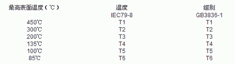 這是與氣體點(diǎn)燃溫度有關(guān)的電氣設(shè)備(假定環(huán)境溫度為40℃時(shí))的最高表面溫度,點(diǎn)燃能量與點(diǎn)燃溫度無關(guān)。在標(biāo)準(zhǔn)BS5345第一部分中列出了所有可燃性氣體和其組別。