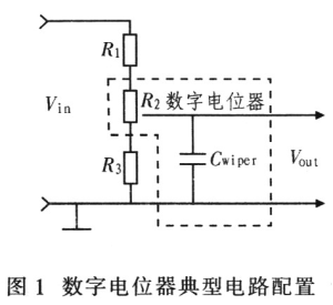 圖1為電位器典型的電路配置,圖中,數(shù)字電位器用于改變信號的衰減量。R2為數(shù)字電位器,Cwiper為寄生電容,該電容是所有數(shù)字電位器固有的,它限制電路帶寬。當電位器在0至滿量程之間擺動時,R1和R3用于限制數(shù)字電位器引起的信號衰減。