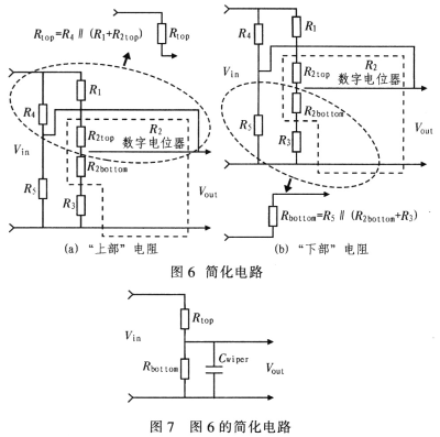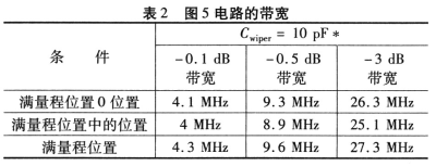 利用式(1)中的R1和R3電阻值,假設Cwiper=10pF,獲得表l所列的帶寬。實際觸點電容在3~80 pF內(nèi),并與觸點電阻、步長數(shù)、采用的IC工藝及電位器體系結(jié)構(gòu)等有關。3~5 V供電、32至256步長的10 kΩ電位器的典型電容值為3~10 DF。