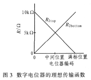 需要說明的是:由于該電路采用運算放大器,可用于信號放大和衰減。因此,以下介紹的提高帶寬的方法與所選電路拓撲無關。為計算電路的傳輸函數(shù)(VOUT/VIN),可使用不同模式的電位器,見圖2。圖中,R2被分為R2top和R2bottom,其中,R2top是電位器觸點以上的電阻,R2bottom是電位器觸點以下的電阻。假設使用的電位器具有10 kΩ的端到端電阻(忽略觸點電阻的影響),R2top和R2bottom是相對于數(shù)字編碼的理想傳輸函數(shù),如圖3所示。傳輸函數(shù)的兩個端點和中點:當電位器編碼為0時,R2top=10 kΩ,R2bpttom=0kΩ;而當電位器編碼處于中間位置時,則R2top=R2bottom=5 kΩ;當電位器編碼處于滿標位置時,R2top=0 kΩ,R2bottom=10 kΩ。