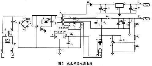 電源是電子設(shè)備的核心部分,其質(zhì)量的好壞直接影響著電子設(shè)備的可靠性,而且電子設(shè)備的故障大都來自電源,因此在設(shè)計(jì)電子設(shè)備時(shí),電源的設(shè)計(jì)十分重要,F(xiàn)代電子設(shè)備使用的電源大致有線性穩(wěn)壓電源和開關(guān)電源兩大類。所謂線性穩(wěn)壓電源,就是其調(diào)整管工作在線性放大區(qū)。這種穩(wěn)壓電源的主要缺點(diǎn)是變換效率低,一般只有35%~60%;開關(guān)穩(wěn)壓電源的調(diào)整管工作在開關(guān)狀態(tài),主要的優(yōu)越性就是變換效率高,可達(dá)70%~95%。此外,開關(guān)穩(wěn)壓電源還有功耗小、穩(wěn)壓范圍寬、體積小、重量輕、安全可靠等優(yōu)點(diǎn)。目前電子設(shè)備的穩(wěn)壓電源逐漸被開關(guān)穩(wěn)壓電源所取代。在本系統(tǒng)中,由于在檢測(cè)部分要用到C55460A,為了避免干擾,需要模擬和數(shù)字兩路+5 V電源,因此,在開關(guān)穩(wěn)壓電源部分也需要有兩路+5 V電源。該部分電路原理圖,如圖2所示。