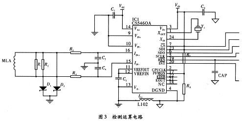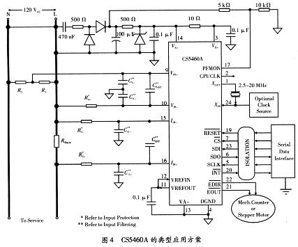 如圖4所示為CS5460A在單電源單相2線系統(tǒng)的功率測(cè)量方案,該圖用于監(jiān)控電源線電流的電阻分流器聯(lián)接在電源的火線端。