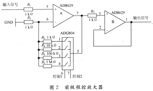 該部分中,實(shí)現(xiàn)增益控制主要依靠通道選擇,本方案中采用四通道選擇器ADG804,該器件導(dǎo)通電阻小于0.8 Ω,單電源供電,封裝小,溫度適應(yīng)性強(qiáng),通過(guò)地址線A0和A1選擇導(dǎo)通路。單片機(jī)I/O口送數(shù)至ADG804的地址輸入端,選擇不同的反饋電阻值Rf,通過(guò)式(1)得到不同的放大增益系數(shù)G,進(jìn)而確定事先定義的不同檔位的切換。G=Vo/Vi=Rf/Ri (1)