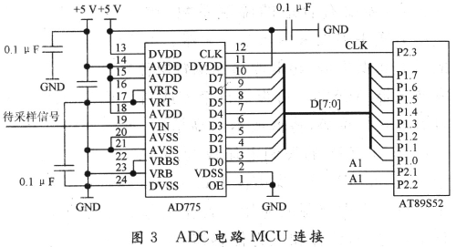 選擇使用AD775作為本方案中的A/D變換器。AD775是一款CMOS、低功耗、8位、20 MSPS采樣模數(shù)轉(zhuǎn)換器(ADC),內(nèi)置采樣功能和片內(nèi)基準(zhǔn)電壓偏置電阻,可提供完整8位ADC解決方案。它采用流水線式或乒乓兩步式FLASH架構(gòu),可提供最高35 MHz的采樣速率,同時(shí)保持極低的功耗(60 mW)。該器件融合了出色的微分非線性(DNL)、高采樣速率、低差分增益與相位誤差、極低功耗以及+5 V單電源工作等特性,其參考電阻可采用多種配置方式進(jìn)行連接,以處理不同的輸入范圍。與傳統(tǒng)的FLASH型轉(zhuǎn)換器相比,低輸入電容提供易于驅(qū)動(dòng)的輸入負(fù)載。圖3給出ADC的外圍電路以及和MCU數(shù)據(jù)傳輸?shù)倪B接關(guān)系。