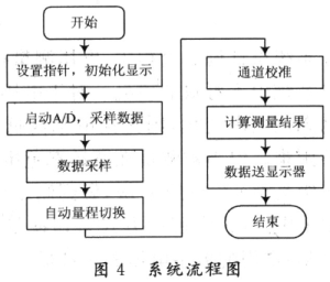 軟件設(shè)計(jì)采用模塊化設(shè)計(jì)思想,每個(gè)模塊實(shí)現(xiàn)特定的功能。系統(tǒng)軟件包括主程序、定時(shí)中斷程序和一系列功能子程序。上電后程序初始化,進(jìn)入監(jiān)控狀態(tài),顯示待機(jī)界面等待測(cè)量。測(cè)量時(shí)啟動(dòng)A/D后,首先選擇最大量程對(duì)外部數(shù)據(jù)進(jìn)行采樣計(jì)算并判斷,確定合適的量程。切換量程后再次采樣,記錄得到的數(shù)據(jù),通過(guò)相應(yīng)對(duì)相應(yīng)量程的計(jì)算,得到測(cè)量的電壓。如果需要,MCU可與微型打印機(jī)通過(guò)并口連接,將存儲(chǔ)于RAM中的電壓歷史數(shù)據(jù)和當(dāng)前數(shù)據(jù)打印出來(lái),作為資料存檔保留,系統(tǒng)流程圖如圖4所示。