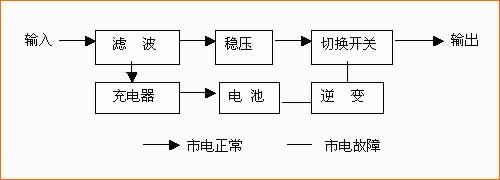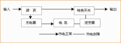 UPS主要分為兩大類三種形式:一類是后備式,另一類是在線式,還有一種介于 兩者之間的在線互動式。這是在線式UPS的原理圖,主要由整流器、逆變器、靜態(tài)轉(zhuǎn)換開關(guān)和后備電池組成。輸出的交流電源是經(jīng)過逆變器重新產(chǎn)生,其電壓、波形頻率由UPS本身控制,具有穩(wěn)壓、穩(wěn)頻、凈化和不間斷等功能。