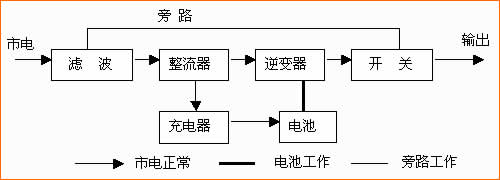 后備式UPS在市電正常時直接由市電向負載供電,當市電超出其工作范圍或停電時,通過轉換開關轉為電池逆變供電。其特點是:結構簡單,體積小,成本低,但輸入電壓范圍窄,輸出電壓穩(wěn)定精度差,有切換時間,且輸出波形一般為方波。