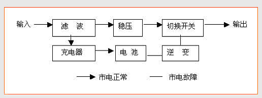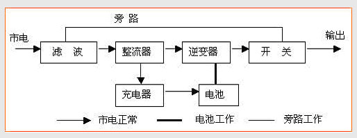 UPS主要分為兩大類三種形式:一類是后備式,另一類是在線式,還有一種介于兩者之間的在線互動式。這是在線式UPS的原理圖,主要由整流器、逆變器、靜態(tài)轉(zhuǎn)換開關和后備電池組成.輸出的交流電源是經(jīng)過逆變器重新產(chǎn)生,其電壓、波形頻率由UPS本身控制,具有穩(wěn)壓、穩(wěn)頻、凈化和不間斷等功能。