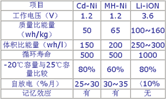 鋰離子電池與Cd-Ni和MH-Ni比較特性列表(圖)