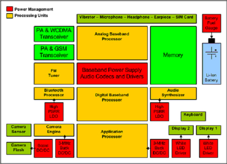 圖字(上下、左右):電源管理、處理單元、PA與WCDMA收發(fā)器、PA與GSM收發(fā)器、調(diào)頻接收器、藍(lán)牙處理器、高PSRR LDO、相機(jī)傳感器、相機(jī)閃光燈、相機(jī)引擎、升壓DC/DC、3MHz降壓DC/DC、振動器-麥克風(fēng)-耳機(jī)-耳承-SIM卡、模擬基帶處理器、基帶電源/音頻編解碼器與驅(qū)動器、數(shù)字基帶處理器、應(yīng)用處理器、存儲器、音頻綜合器、高PSRR LDO、鍵盤、顯示屏1、顯示屏1、3MHz降壓DC/DC、白LED驅(qū)動器、白LED驅(qū)動器、電池容量計(jì)、鋰離子電池。