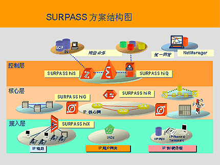 * 在網(wǎng)絡(luò)的控制層,SURPASS方案包括信令網(wǎng)關(guān)、呼叫性能服務(wù)器、媒體網(wǎng)關(guān)控制器以及開放的業(yè)務(wù)接口API,并提供對現(xiàn)有智能網(wǎng)業(yè)務(wù)的支持,實現(xiàn)對于整個數(shù)據(jù)網(wǎng)絡(luò)用戶電信級業(yè)務(wù)和增值業(yè)務(wù)的提供、信令的支持和不同網(wǎng)絡(luò)設(shè)備之間的協(xié)調(diào)工作。