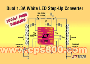 凌特公司(Linear Technology)日前推出專門用于以恒定電流驅(qū)動(dòng)多達(dá)16個(gè)白光LED (每通道串聯(lián)8個(gè)LED)的雙輸出升壓型DC/DC轉(zhuǎn)換器——LT3486。此外,真正的PWM調(diào)光給LED提供恒定電流,保持所發(fā)出的光具有恒定顏色。調(diào)光以PWM驅(qū)動(dòng)器的占空比控制。這種方法容許1000:1的寬調(diào)光范圍。該器件輸入電壓范圍為2.5V至24V,可用于從鋰離子電池供電的手持產(chǎn)品到汽車背光照明應(yīng)用的各種應(yīng)用中。