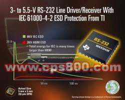 德州儀器(TI)宣布推出具有系統(tǒng)級(jí)IEC 61000-4-2 ESD(靜電)保護(hù)功能的新型RS-232器件。在這些器件中集成IEC 61000-4-2保護(hù)使RS-232接口在系統(tǒng)運(yùn)行期間能夠抵御靜電沖擊的損害,如在系統(tǒng)啟動(dòng)后連接至RS-232電纜的情況下。這些器件的另一顯著優(yōu)勢(shì)是消除了外接 IEC ESD保護(hù)器件,從而可顯著節(jié)省板級(jí)制造商的組裝成本及板級(jí)空間。TI具有IEC ESD保護(hù)功能的首批器件包括:MAX3243E、MAX3232E與MAX3227。