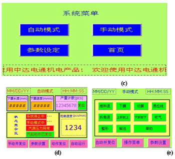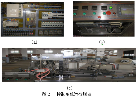 LS-300L型包裝機(jī)所有機(jī)構(gòu)全部采用氣動(dòng)組件,全部采用氣動(dòng)控制,在同行業(yè)同類(lèi)型產(chǎn)品中屬于中高檔機(jī)種。該包裝機(jī)對(duì)于各種形狀、大小的包裝盒都能包裝塑料膜,只需通過(guò)控制系統(tǒng)的人機(jī)界面對(duì)輸送軌道的寬度、包裝膜的長(zhǎng)寬、折角整形的寬度等進(jìn)行調(diào)整就能夠進(jìn)行包裝。系統(tǒng)主要采用臺(tái)達(dá)工控產(chǎn)品DOP-A57CSTD,DVP-32EH00T,ASD-A0421LA,ASMT04L250AK,DTA4848等構(gòu)成系統(tǒng),包裝機(jī)控制系統(tǒng)運(yùn)行現(xiàn)場(chǎng)如圖2(a)、圖2(b)和圖2(c)所示。