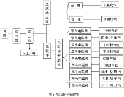 控制系統(tǒng)的控制有3種工作方式:1)手動(dòng)操作;2)單動(dòng)操作;3)自動(dòng)連續(xù)操作。氣動(dòng)部件控制框圖如圖3 所示。以下對(duì)控制系統(tǒng)手動(dòng)操作方式考慮作簡(jiǎn)要說(shuō)明,單動(dòng)操作和自動(dòng)連續(xù)操作與手動(dòng)操作方式類(lèi)似,不再多敘。