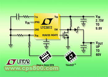 凌特公司推出具 550kHz 工作頻率的電流模式升壓型 DC/DC 控制器 LTC3872。LTC3872 無需檢測電阻,因此節(jié)省了電路板空間并提高了效率。這是一個(gè)高度緊湊的解決方案,用于將 2.5V 至 9.8V 的輸入電壓轉(zhuǎn)換為較高的輸出電壓。無需檢測電阻可以實(shí)現(xiàn)高達(dá) 60V 的 VOUT;如果使用檢測電阻時(shí),輸出電壓僅受外部組件限制。視外部 MOSFET 的選擇而定,LTC3872 可以輕松達(dá)到非常高的峰值電流。該集成電路的高工作頻率降低了電感器和電容器的值和尺寸。其小占板面積加上高達(dá) 90% 的工作效率使得在非常緊湊的面積上放置大電流升壓型轉(zhuǎn)換器成為可能。應(yīng)用包括電信電源、42V 汽車系統(tǒng)、24V 工業(yè)控制系統(tǒng)、IP 電話電源和由鋰離子電池供電的設(shè)備。