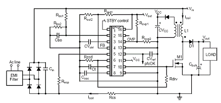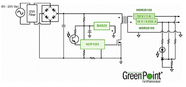 這個(gè)參考設(shè)計(jì)的關(guān)鍵器件是NCP1351,這是一款針對(duì)低功耗離線反激開關(guān)電源(SMPS)設(shè)計(jì)的電流模式控制器。它采用固定峰值電流技術(shù)(固定Ton),可以在負(fù)載變低時(shí)降低開關(guān)頻率。因此,采用NCP1351的電源自然可以提供卓越的待機(jī)(空載)能耗,同時(shí)也能夠在其他負(fù)載情況下達(dá)到最佳的能效表現(xiàn)。當(dāng)頻率下降時(shí),峰值電流會(huì)逐漸降低到最大峰值的約30%,以避免變壓器發(fā)生機(jī)械振蕩,因此可以大幅度降低發(fā)生可聽見噪聲的風(fēng)險(xiǎn),并保持良好的待機(jī)能耗表現(xiàn)。