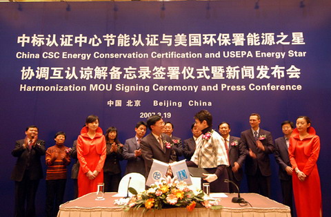 2007年3月19日,中標(biāo)認(rèn)證中心與美國環(huán)保署在北京舉行新聞發(fā)布會,雙方正式簽署了中標(biāo)認(rèn)證中心節(jié)能認(rèn)證與美國環(huán)保署能源之星協(xié)調(diào)互認(rèn)諒解備忘錄,來自國家發(fā)展和改革委員會、國家質(zhì)量監(jiān)督檢驗檢疫總局、國家認(rèn)證認(rèn)可監(jiān)督管理委員會、國家標(biāo)準(zhǔn)化管理委員會等相關(guān)部委的政府官員、美國駐華大使館、相關(guān)行業(yè)的國內(nèi)外代表及新聞記者60余人出席了簽字儀式。
