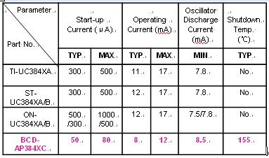 384X 系列電流型PWM控制器已廣泛應(yīng)用于開關(guān)電源設(shè)計(jì)中。許多半導(dǎo)體廠商都生產(chǎn)此標(biāo)準(zhǔn)電源管理控制芯片。表一列出了BCD和三個(gè)主要競爭對手產(chǎn)品的關(guān)鍵參數(shù)對比。