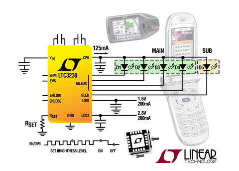 凌力爾特公司(Linear Technology Corporation)推出具有兩個(gè) LDO 穩(wěn)壓器的集成式白光 LED 驅(qū)動器 LTC3230,該器件在便攜式電子產(chǎn)品中用于驅(qū)動主和副 LED 顯示屏和提供低壓系統(tǒng)電源軌,并采用了緊湊型 3mm x 3mm QFN 封裝。LTC3230 驅(qū)動多達(dá) 5 個(gè) 25mA LED 電流源,提供 125mA 的總輸出電流,集成了兩個(gè) 200mA LDO ,具有單獨(dú)的使能引腳以及分別低至 1.2V 和 1.8V 的引腳可選輸出電壓。LTC3230 的 2.7V 至 5.5V輸入電壓范圍已經(jīng)為單節(jié)鋰離子/聚合物應(yīng)用而優(yōu)化。用鋰離子電池(標(biāo)稱值為 3.6V)驅(qū)動時(shí),效率達(dá)到 91%,靜態(tài)電流僅為 400uA,最大限度地延長了電池工作時(shí)間。LTC3230 僅需要 6 個(gè)小型電容器和一個(gè)電阻器就可組成纖巧扁平(封裝占板面積 <9mm2,高度為 0.75mm)的解決方案。