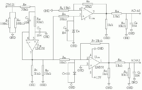 合母電壓監(jiān)測電路如圖2所示。合母電壓流過電阻R16、R17、R54,在電阻R17上取樣,故而電阻R17應(yīng)選用高精度電阻。R16和R54因為要比電阻R17大得多,又是出現(xiàn)在分母上,故而不必選用高精度電阻。LL的作用是抑制共模干擾?梢酝ㄟ^調(diào)節(jié)電位器Rp的大小來使所要監(jiān)測電壓的大小符合AD轉(zhuǎn)換器輸入電壓要求。