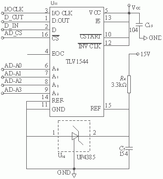 AD轉(zhuǎn)換芯片采用TLV1544。TLV1544的主要特點是:寬范圍的單電源供電,VCC可為2援7耀5援5V;芯片內(nèi)部有著較高的轉(zhuǎn)換速率,轉(zhuǎn)換時間小于10滋s;芯片提供4路外部輸入通道,通過編程給芯片不同的狀態(tài)字設(shè)置可以任意選擇4個輸入通道之一;芯片有4個端口作為同步串行接口,通過SPI總線的形式與微處理器連接;11位AD轉(zhuǎn)換,足以滿足系統(tǒng)的要求。如圖3所示。