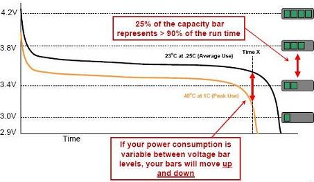 錢金榮表示,TI早在2004年便推出了具備阻抗跟蹤的電池監(jiān)測產(chǎn)品,如BQ20Z70、BQ20Z80、BQ20Z90以及BQ20Z95,這些產(chǎn)品主要用于筆記本電腦。TI于近期推出了用于手機(jī)等設(shè)備的電池監(jiān)測產(chǎn)品BQ27500和BQ27350。BQ27500可用于母板上,BQ27350則主要用于電池包中。錢金榮稱當(dāng)電池老化時(shí),這些產(chǎn)品的精確度可以達(dá)到100%,因此能夠很好的提高電池使用效率。正是因?yàn)榭梢跃_測量電池的剩余電量,有廠商甚至利用此功能開始生產(chǎn)以百分比形式顯示剩余電量以及同時(shí)顯示剩余使用時(shí)間的智能手機(jī)。如圖2所示。