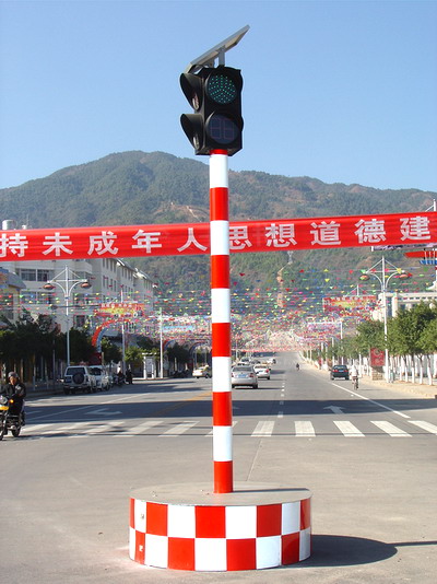 旗山、華旭2個小區(qū)是臨翔區(qū)政治、經(jīng)濟文化中心,也是臨滄市委、市政府所在地,十字路口較多、交通十分擁擠。為了在節(jié)能、減排的時代主題下,科學地解決好上述2個小區(qū)交通擁擠問題,為兩節(jié)(元旦、春節(jié))交通安全、和諧、暢通提供科技保障支撐,臨翔區(qū)政府投資12萬元,從江西引進了兩盞以太陽能電池供電為能源、具有環(huán)保、節(jié)能、耗資少三大特點的太陽能紅綠燈。據(jù)臨翔區(qū)公安分局交警大隊大隊長肖林介紹:與老式紅綠燈相比,太陽能紅綠燈具有環(huán)保、節(jié)能、造價低、安裝簡便等特點,老式紅綠燈每臺造價20萬元左右,且隨著電源供給的緊缺,時常出現(xiàn)交通指揮信號中斷現(xiàn)象。而太陽能紅綠燈每盞只需投入6萬元,不但不用電,即使在斷電或陰雨天氣、沒有光能情況下,也能完全靠電池板供給電能正常指揮交通工作。