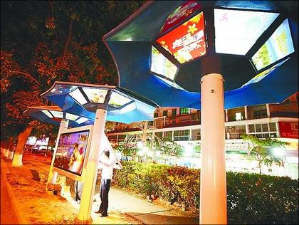 在現(xiàn)場看到,這些太陽能公交車站由一把把撐開的藍(lán)色大傘組成,每把傘頂安裝著6塊太陽能光伏板。施工工人將線路與光伏板接通后,藍(lán)色大傘和公交站上的廣告牌立即亮了起來,照明效果非常好,外觀也很漂亮。