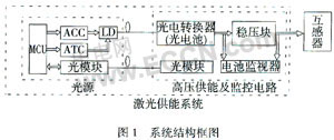 本系統(tǒng)主要包括低壓側(cè)的單片機(jī)、數(shù)字控制電路、激光器、電流控制電路、溫度控制電路和高壓側(cè)的光電池、智能電池監(jiān)視器、穩(wěn)壓塊、線性穩(wěn)壓塊等。單片機(jī)(MCU)通過D/A對激光器的驅(qū)動電流及溫度進(jìn)行設(shè)定,并與高壓側(cè)的智能電池監(jiān)視器通訊,由光模塊將單片機(jī)發(fā)出的指令轉(zhuǎn)換成光信號,通過光纖將信號傳送到高壓側(cè),再由光模塊將光信號轉(zhuǎn)換成電信號傳送給智能電池監(jiān)測器。電池監(jiān)視器根據(jù)單片機(jī)的指令采集光電池輸出的電壓、電流以及互感器的工作電壓,再由光模塊及光纖將采集的數(shù)據(jù)傳送給低壓側(cè)的單片機(jī)。單片機(jī)根據(jù)接收的數(shù)據(jù)(電流和電壓)監(jiān)視光電池的工作狀態(tài),并據(jù)此調(diào)節(jié)激光器的驅(qū)動電流以控制激光器的輸出功率,從而使光電池的輸出功率保持恒定。這樣,通過對光電池工作狀態(tài)的監(jiān)視,根據(jù)光電池的工作狀態(tài)來調(diào)節(jié)激光器的驅(qū)動電流,從而改變激光器輸出光功率的大小,以得到穩(wěn)定的光電池輸出功率。