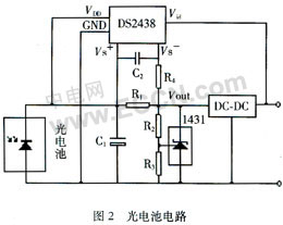 系統(tǒng)要求光電池給互感器提供穩(wěn)定可靠的電源,以保證互感器的正常工作。但是光電池在相同光功率下輸出電功率會隨著負(fù)載的變化而變化。而只有當(dāng)系統(tǒng)負(fù)載發(fā)生長時(shí)間大范圍變動時(shí),反饋系統(tǒng)才調(diào)整光源的光功率輸出。而當(dāng)互感器的阻抗發(fā)生一些瞬時(shí)小范圍波動時(shí),光電池的輸出功率也會隨之發(fā)生變化,這樣就很難保證互感器的正常工作。本系統(tǒng)特別設(shè)計(jì)了光電池電壓自舉泄流電路,使光電池能始終工作在效率最高點(diǎn)附近,且輸出功率不受負(fù)載的影響。并且對光電池電流、電壓和互感器工作電壓進(jìn)行采樣,根據(jù)采樣數(shù)據(jù)來調(diào)節(jié)光電池的輸入光功率,從而進(jìn)一步保證了光電池的輸出穩(wěn)定可靠。如圖2所示,利用串聯(lián)式穩(wěn)壓塊使光電池的輸出電壓固定,本文采用的是德州儀器生產(chǎn)的TL1431,可以輸出參考電壓Vref為2.5 V,并能通過改變電路中R2,R3的阻值,來改變它的輸出電壓Uout=(1+R2/R3)Vref。同時(shí)串聯(lián)穩(wěn)壓塊在這里起到泄流的作用,即當(dāng)互感器不需要那么多的電能時(shí),多余的電能會消耗在串聯(lián)穩(wěn)壓塊上。光電池工作在6.1 V時(shí)輸出電功率最大,但是當(dāng)工作電壓大于6.1 V時(shí),電功率下降得很快。為避免出現(xiàn)這種情況,設(shè)計(jì)光電池的工作電壓時(shí),留出了0.1 V的余量,也就是使光電池工作電壓保持在6 V。通過選取R2,R3使得穩(wěn)壓塊輸出電壓為5.9V,這樣采樣電阻R1的壓降就為0.1 V。由于光電池的工作電流為50 mA,故可求出所需采樣電阻的阻值為2 Ω。互感器所需電壓為5 V,但是光電池提供的電壓為6V,所以采用高效率的線性穩(wěn)壓模塊穩(wěn)壓。