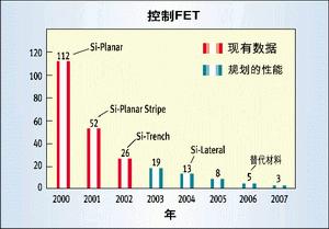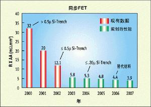 圖2所示的是同步或稱低端(low-side)FET的品質(zhì)因數(shù)。在這里,實際上是傳導(dǎo)損耗主宰了處在導(dǎo)通電阻時域的品質(zhì)因數(shù)。僅在過去的兩年中,通過將1至2微米溝道技術(shù)升級為深亞微米水平,就使品質(zhì)因數(shù)提高了約3倍,今后還有更多的改進余地。