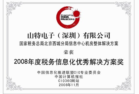 近日,2008年中國企業(yè)CIO年會在京舉行,本次年會以“信息化與工業(yè)化融合下的IT重塑”為主題。中國計算機(jī)報作為權(quán)威的IT媒體,通過組織2008中國信息化年度會議,由工業(yè)和信息化部、國資委指導(dǎo),中國電子信息產(chǎn)業(yè)發(fā)展院、國資委研究中心一起聯(lián)手,邀請行業(yè)中卓越的專家學(xué)者,評出在實踐過程中得到廣泛應(yīng)用的優(yōu)秀產(chǎn)品和解決方案,以成功的信息化項目給更多的企業(yè)以借鑒。山特電子(深圳)有限公司(http://www.santak.com.cn)憑借其在稅務(wù)行業(yè)長期的優(yōu)異表現(xiàn),以及在北京西城國稅機(jī)房改造中所提供的“國家稅務(wù)總局北京西城分局信息中心機(jī)房整體解決方案”,榮獲“2008年度稅務(wù)信息化優(yōu)秀解決方案獎”。