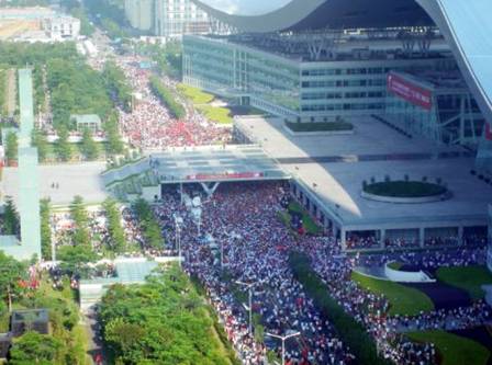 由于火炬在珠峰登頂,因此深圳傳遞儀式推遲了四個(gè)小時(shí)進(jìn)行。但大家的熱情卻一點(diǎn)不減,深圳市民中心早早就被圍了個(gè)水泄不通,國(guó)旗、奧運(yùn)會(huì)旗、中國(guó)心成為眼前最時(shí)尚亮麗的風(fēng)景線。許多人更是全身武裝,臉貼國(guó)旗、身穿“I LOVE CHINA”T恤、手舉國(guó)旗和奧運(yùn)會(huì)旗,現(xiàn)場(chǎng)一片熱血沸騰。