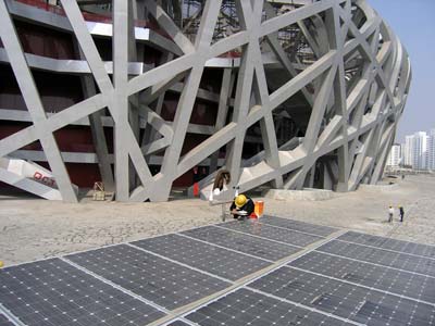 該工程首次采用的綠色能源—太陽能光伏并網(wǎng)發(fā)電系統(tǒng),總裝機容量為100千瓦,采用我公司最新研發(fā)的5KW并網(wǎng)逆變器,產(chǎn)品安裝在“鳥巢” 中包括主門在內(nèi)的七個進出口門的入口處,其技術(shù)要求達到國際領(lǐng)先的水平。我公司與無錫尚德公司合作,通過激烈的竟爭,最終以較高的性價比及擁有較多的成功業(yè)績而中標,并成為該系統(tǒng)的唯一供應(yīng)方,安裝運行后,對“鳥巢”的電力供應(yīng)將起到良好的補充和示范作用。