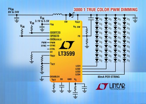 2009年1月22日-北京-凌力爾特公司(Linear Technology Corporation)推出一個(gè)45V、2.1MHz DC/DC升壓模式轉(zhuǎn)換器LT3599,該器件可作為一個(gè)恒定電流LED驅(qū)動(dòng)器工作,用于多達(dá)40個(gè)白光LED。LT3599可從一個(gè)12V輸入驅(qū)動(dòng)多達(dá)4個(gè)LED串,且每串具有多達(dá)10個(gè)串聯(lián)的120mA白光LED,同時(shí)提供高達(dá)90%的效率。其多通道能力使該器件非常適用于中等規(guī)模的TFT-LCD背光照明應(yīng)用。LT3599的3.1V至30V輸入電壓范圍非常適合于汽車、醫(yī)療和工業(yè)應(yīng)用。該器件提供1.5%的LED電流匹配,以保證一致的顯示亮度。高達(dá)3000:1的調(diào)光比可以通過使用True Color PWM™調(diào)光獲得?删幊200kHz至2.1MHz固定頻率工作和電流模式架構(gòu)在寬電源和輸出電壓范圍內(nèi)提供穩(wěn)定工作,同時(shí)最大限度地減小了外部組件尺寸。此外,開關(guān)頻率可同步至外部時(shí)鐘,以改善抗噪聲性能。LT3599的耐熱增強(qiáng)型5mmx5mm QFN或TSSOP-28E封裝為L(zhǎng)ED背光照明應(yīng)用提供一個(gè)占板面積高度緊湊的解決方案。