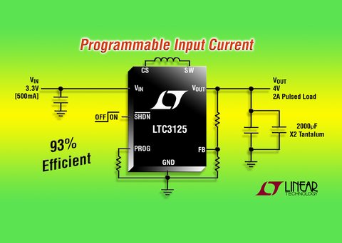 LTC3125的平均輸入電流限制在200mA至1000mA之間,能以±5%的準(zhǔn)確度編程。準(zhǔn)確可調(diào)節(jié)的電流限制再結(jié)合一個(gè)輸出存儲(chǔ)電容器使LTC3125非常適合于諸如GSM和GPRS板卡等應(yīng)用,這類(lèi)應(yīng)用需要從功率受限的輸入電源獲取2A或更大的電流脈沖。此外,LTC3125的準(zhǔn)確輸入電流在電池后備系統(tǒng)中實(shí)現(xiàn)了大型超級(jí)電容器的安全和快速充電,而并未使電池或輔助電源承受過(guò)應(yīng)力。